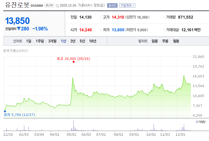 - 정리하면, 유진로봇 주가는 2025년 상반기 5월 중순까지 급격히 상승했고, 이후 6월부터 7월까지 조정을 받았다. 그 후 7월부터 연말까지 점진적으로 회복하며 상승세를 이어갔다. 상승 폭이 크고 변동성이 있었던 만큼, 산업 정책과 기술 혁신 기대가 주가에 크게 영향을 미쳤다고 볼 수 있다.